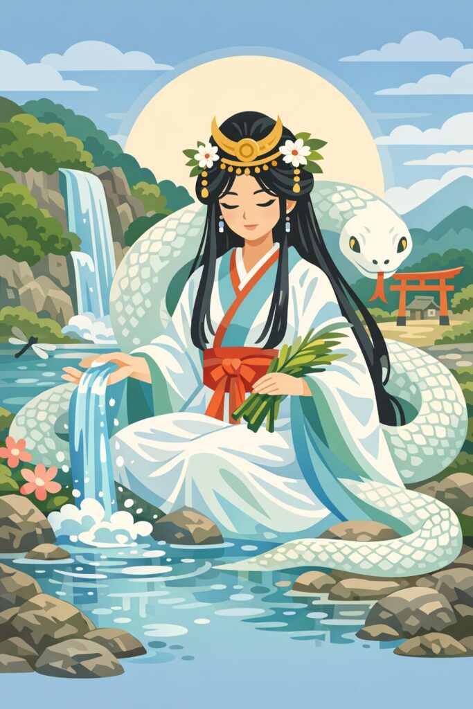 「ミツハ(みづは)」という語には、まさに“水が這う・走る”という古層の感覚が宿っており、罔象女神はその水の動きと霊力を女性神格として表した存在です。湧水や井戸の底に白蛇が棲むという伝承、川の淵に現れるミズチの話、雨乞いの場で蛇体の神を祀る風習など、全国に残る民俗はすべて「水の霊=蛇」という世界観を裏付けています。