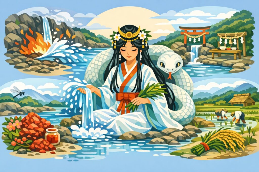 さらに、罔象女神は農耕社会において欠かせない「水路・湧水・田の水」を守る神としても重要でした。田畑に水を引き、季節ごとに水量を調整し、作物を育てるための水を確保することは、古代の生活そのものを支える行為です。罔象女神はその水の流れを司り、豊穣をもたらす守護神として祀られました。水が安定して流れることは、村の繁栄と命の継続を意味し、女神はその根幹を支える存在として深く信仰されたのです。
