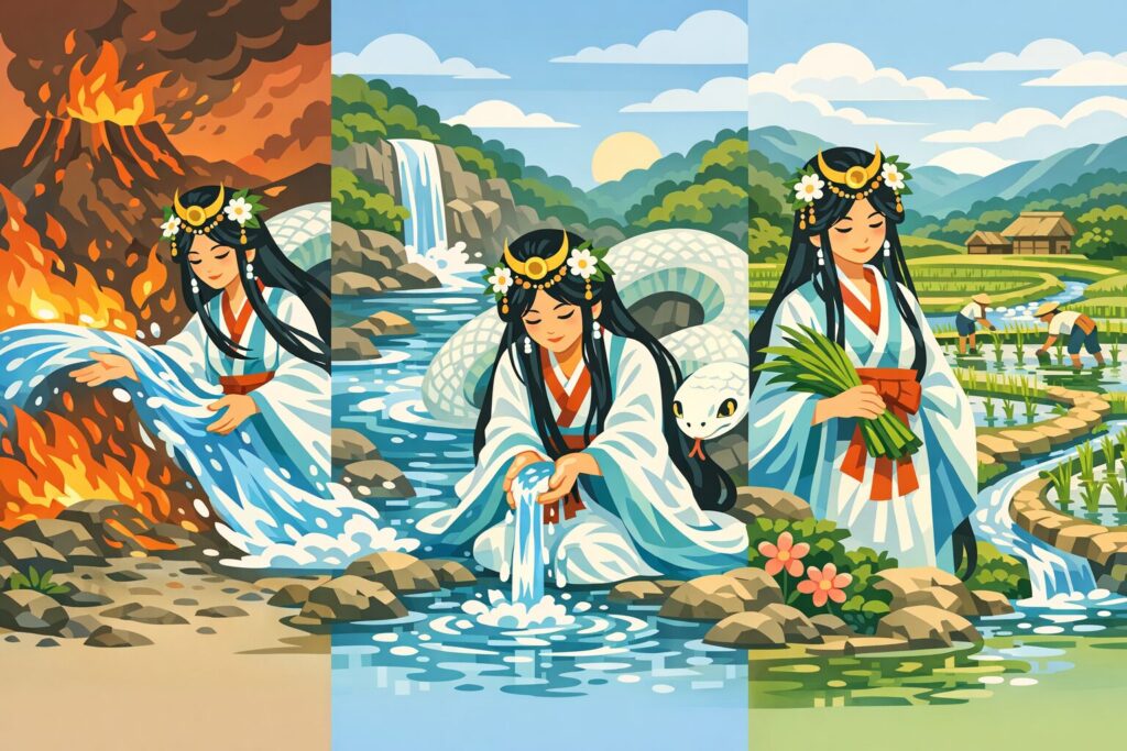 このように、罔象女神は火を鎮める力、浄化と再生の力、そして農耕を支える水の管理という三つの役割を通して、古代日本の生活と精神世界の中心に位置する水神として理解されていました。