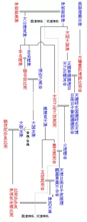 大物主神は活玉依毘売(いくたまよりひめ)を妻とし、娘の姫蹈鞴五十鈴姫命(ひめたたらいすずひめ)は神武天皇の皇后となり、五十鈴依姫命は綏靖天皇の皇后となりました。大物主神の子孫とされる大田田根子は大神神社の神官となり、三輪氏・大三輪氏・大神氏・賀茂氏など、後の大和の有力氏族の祖となります。これは、三輪山の神が単なる自然神ではなく、王権の成立に深く関わる“政治的な神”でもあったことを示しています。