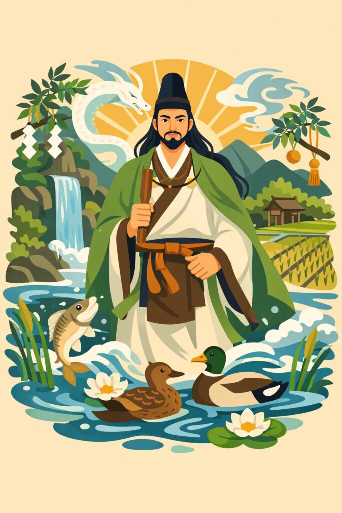 鴨氏はまさにその役割を担い、川の氾濫を抑え、用水路を整備し、田を守り、祭祀を通じて自然の力を鎮める存在でした。彼らの活動は、政治・宗教・技術が未分化だった古代社会において、共同体の中心そのものであり、その根源的な力を象徴する存在として大鴨積命が位置づけられました。大鴨積命が水神的性格を帯びるのは、彼が「水を制する者」であった鴨氏の祖として記憶されたからであり、洪水を鎮め、稲作を守る力は、実際の生活に直結する現実的な神威として受け止められていました。