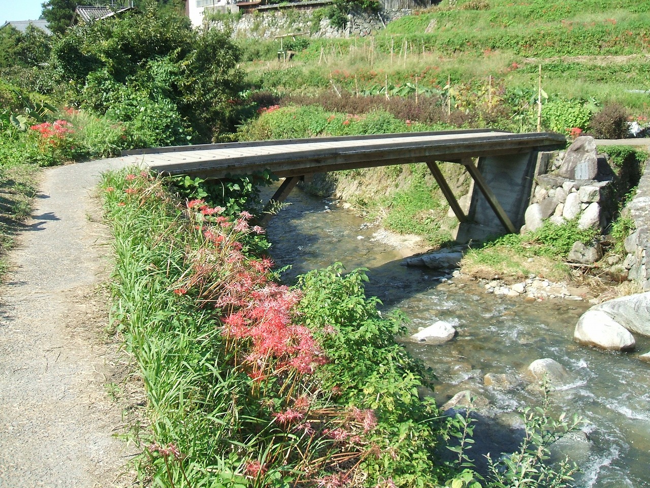 飛鳥川沿いを歩くと、水面には高く澄んだ秋空が映り込み、川の流れがどこかゆったりと感じられます。草むらからはコオロギの澄んだ音が響き、夏の喧騒が遠ざかり、秋の静けさが川辺に満ちていました。飛び石の近くにも彼岸花がひっそりと咲き、川風に揺れる赤い花が、流れの青と美しい対比を見せています。