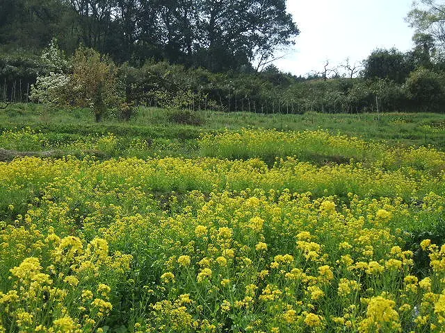 棚田の畔では、菜の花が早くも咲き始めていました。黄色い小さな花が、まだ色の少ない棚田に明るい灯りをともすように点々と広がり、梅の淡い色とやさしく調和しています。陽射しを受けて揺れる菜の花は、春の光そのものが形になったようで、眺めているだけで心がほどけていき癒してくれます。