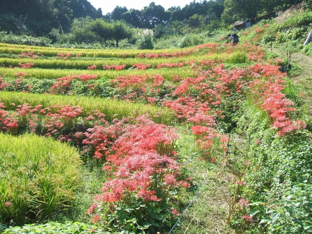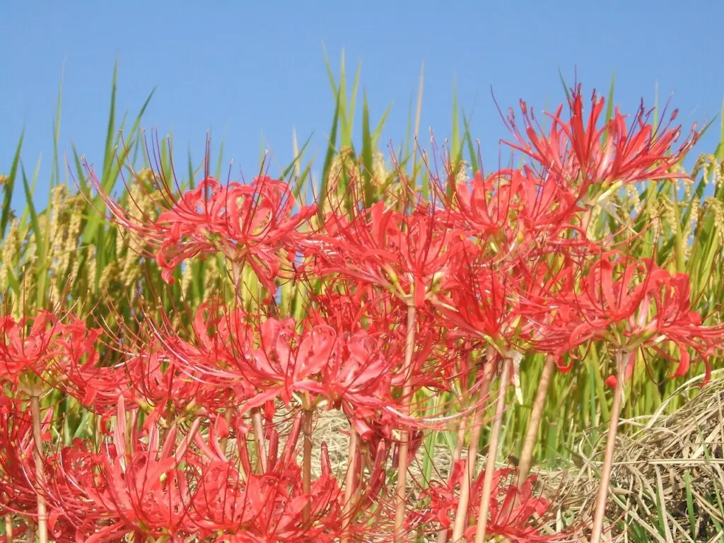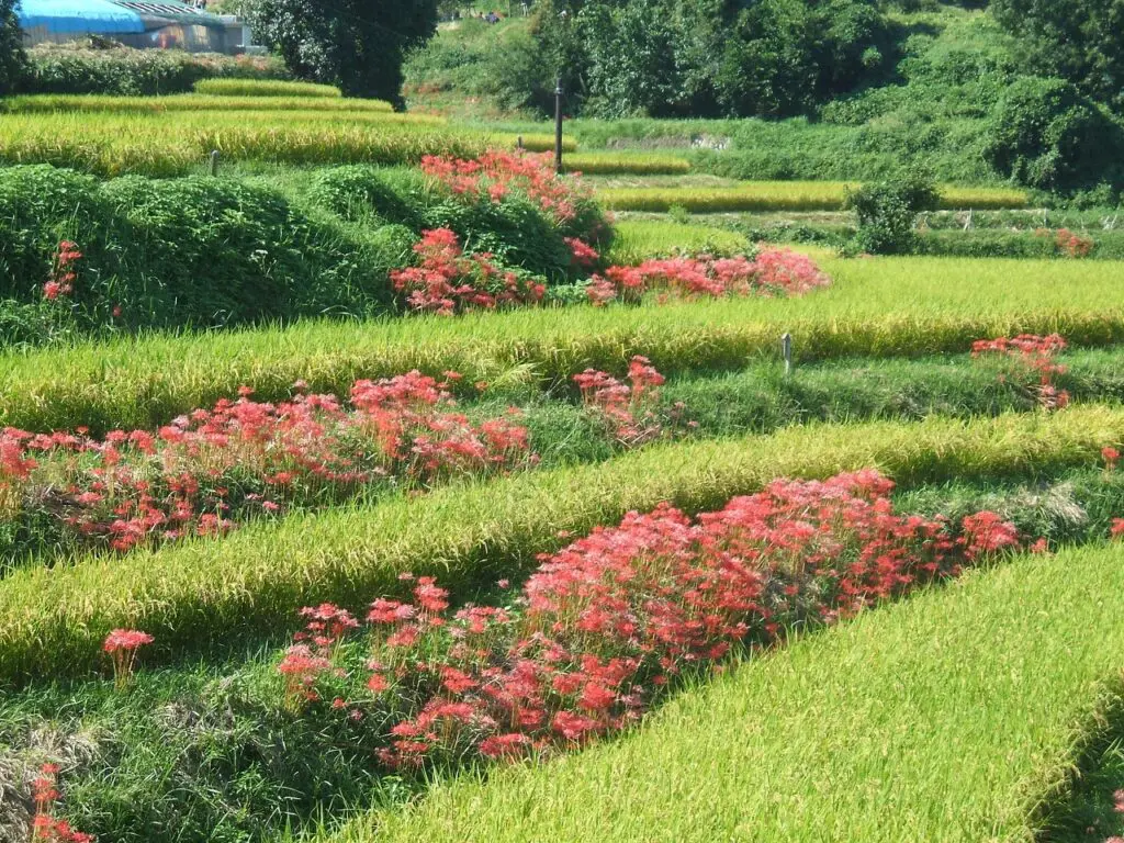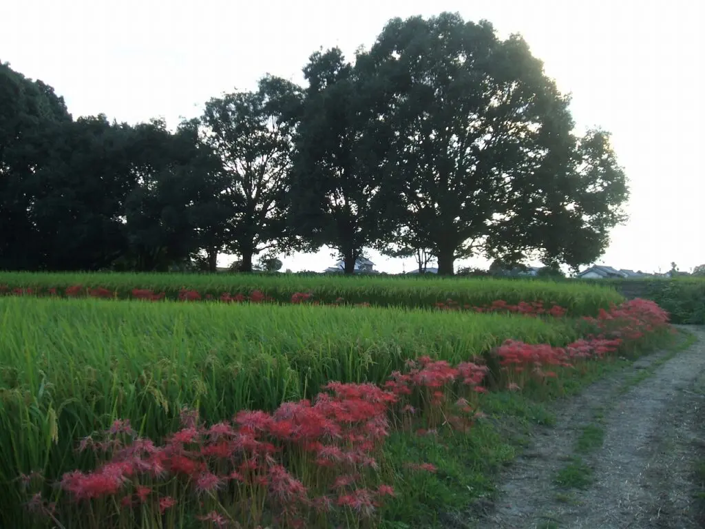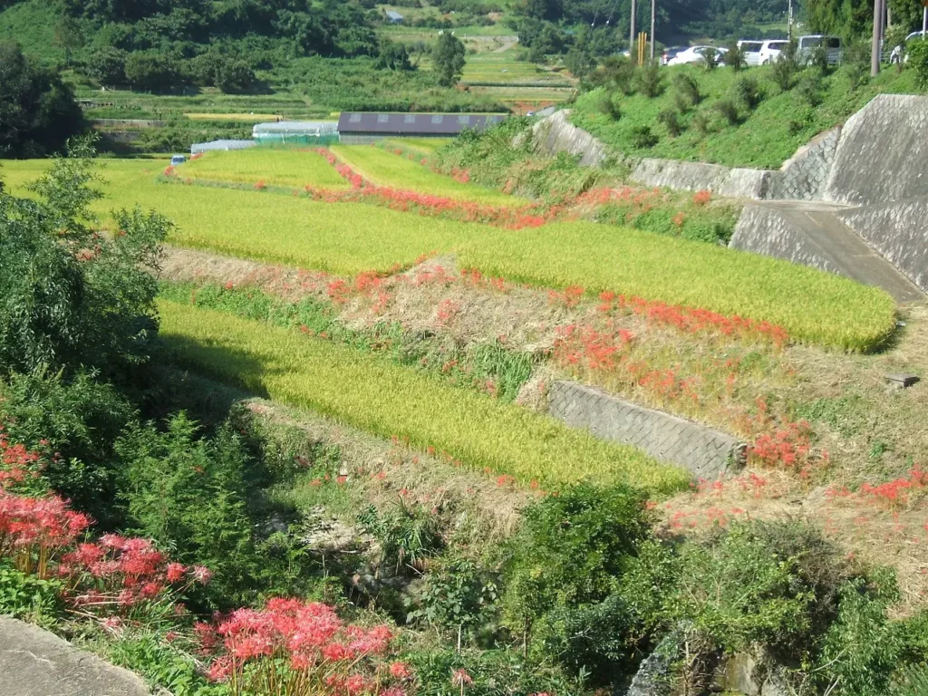 黄金の稲、澄んだ空気、そして彼岸花の赤が織りなす、深く静かな季節の風景。