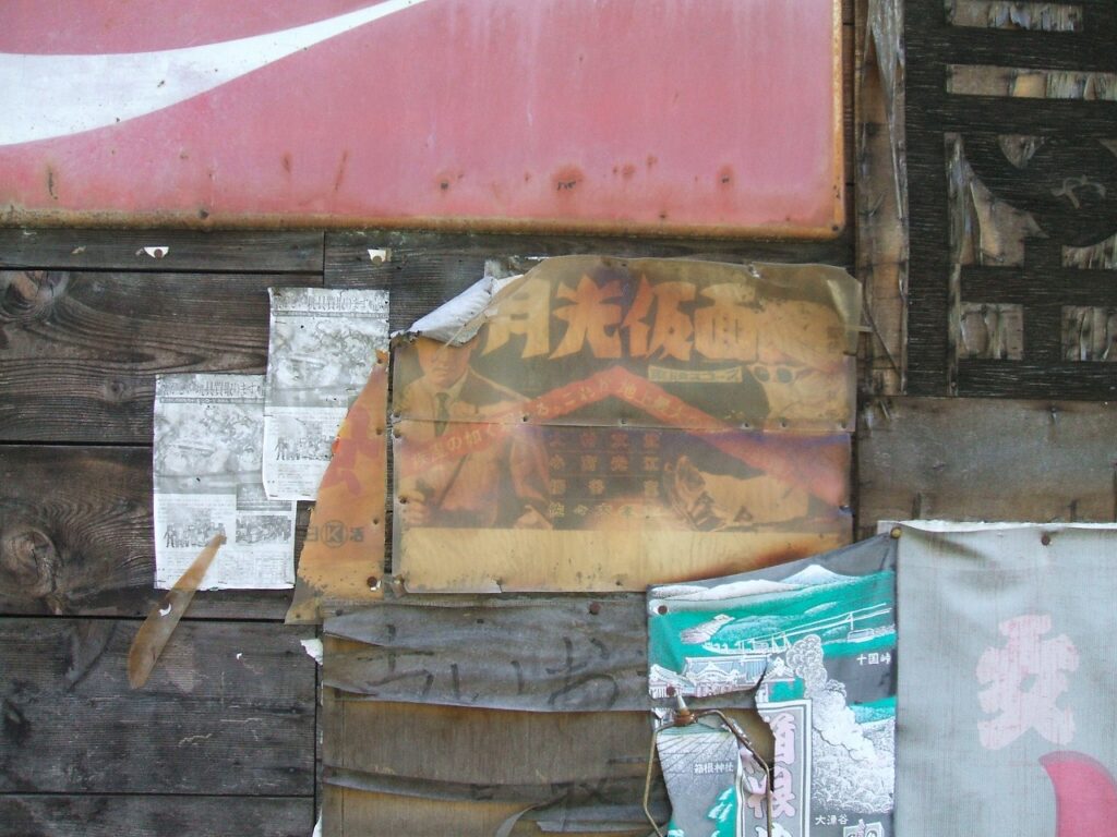 レトロ館でしか見かけないような古い看板が、まるで現役のようにそのまま立てかけられていて、時間がそこだけ取り残されたような不思議な空気が漂っていました。(人は住んでいません)