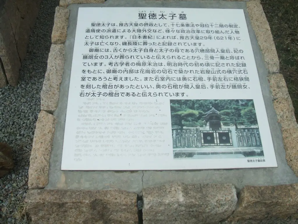 聖徳太子、母・穴穂部間人(あなほべのはしひと)、妃の膳部大郎女(かしわべのおおいらつめ)が葬られている陵墓(三骨一廟)。