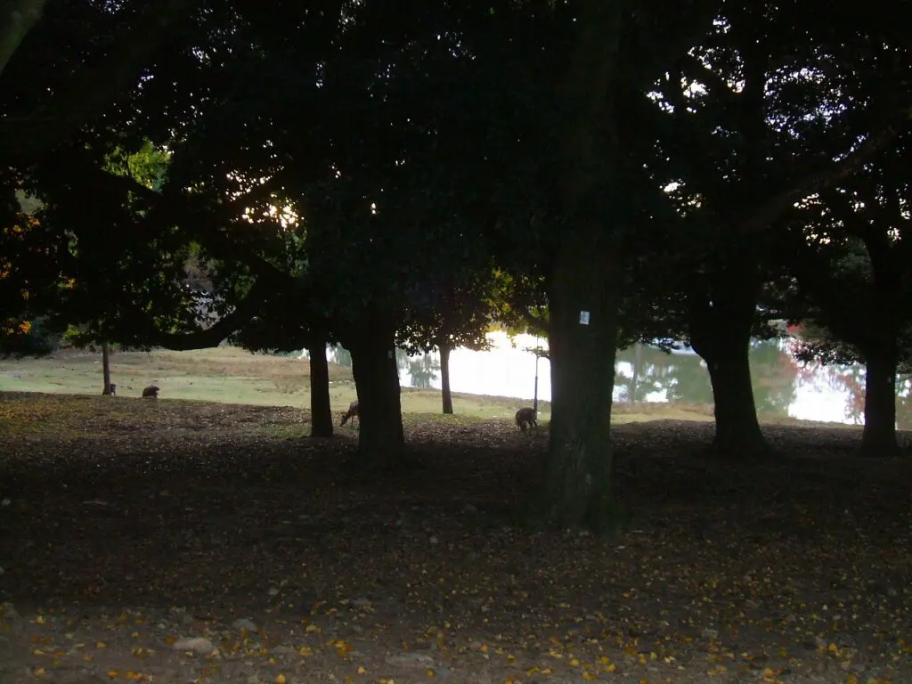 そのまま歩いていくと、道は次第に林の中へと入り、空気がひんやりと変わっていきました。木々が頭上を覆い、光がところどころで細く差し込むだけの薄暗い道です。そんな静かな林の中で、ふいに鹿の姿が目に入るようになりました。あちこちで草を食べたり、ゆっくりと徘徊したりしていて、まるで森の住人たちがこちらを静かに見守っているようでした。
