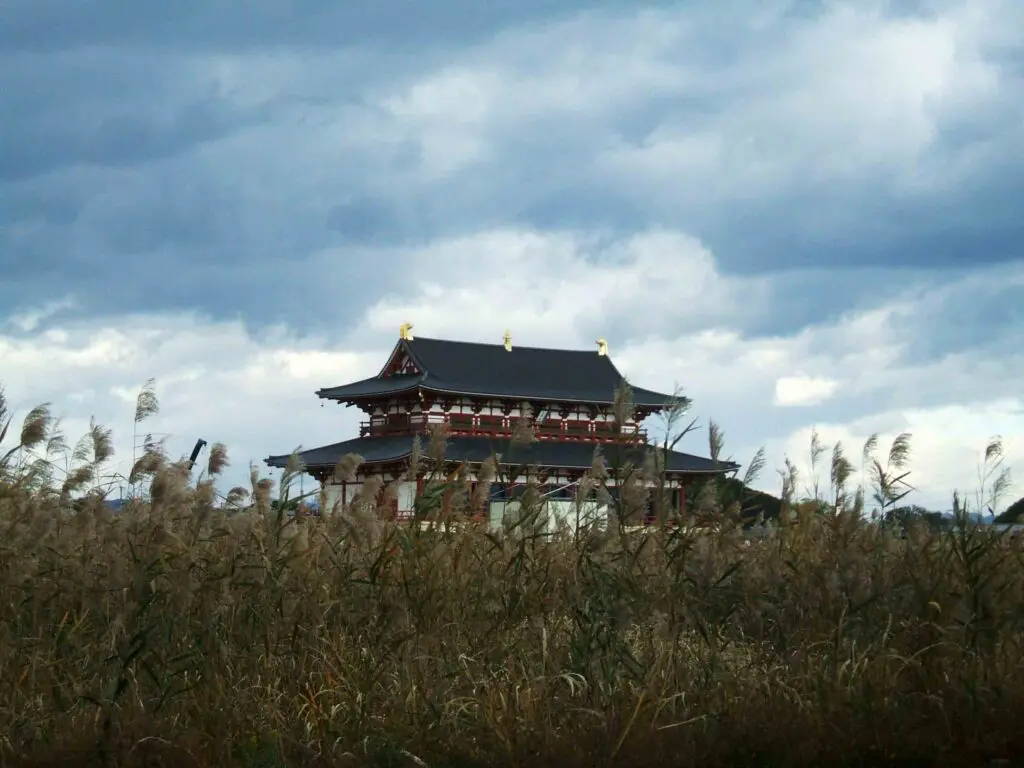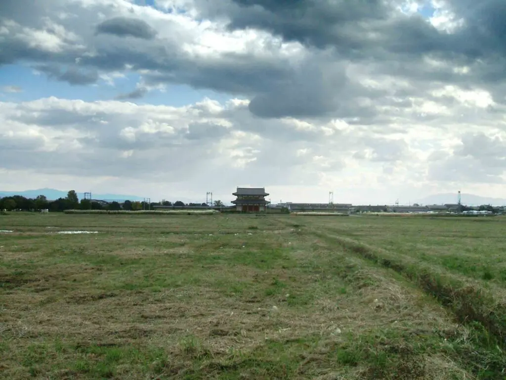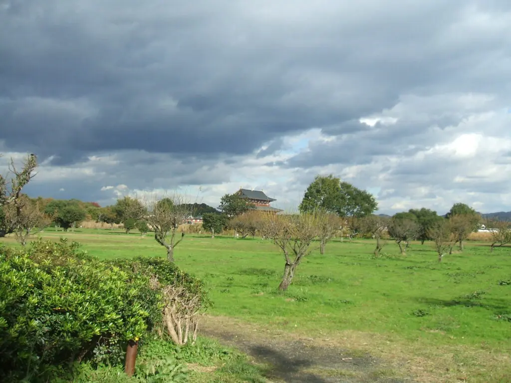 南の方角に目を向けると、広い原っぱの向こうに、再建された大極殿がぽつんと佇んでいました。あの巨大な建物が、かつての都の中心だったとは思えないほど、周囲は静かで、風の音だけが耳に届きます。そこからまっすぐ南へ朱雀大路が伸び、その果て――現在の大和郡山城付近には、かつて羅城門がそびえていました。
