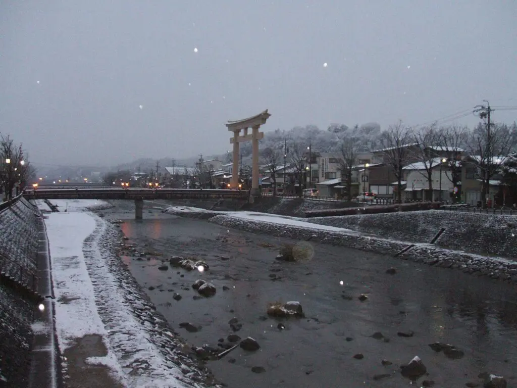 吐く息が白く広がり、その中で笑い声が弾むのが妙に心地よかったのを覚えています。しばらく歩いていると、大きな鳥居が視界に入りました。