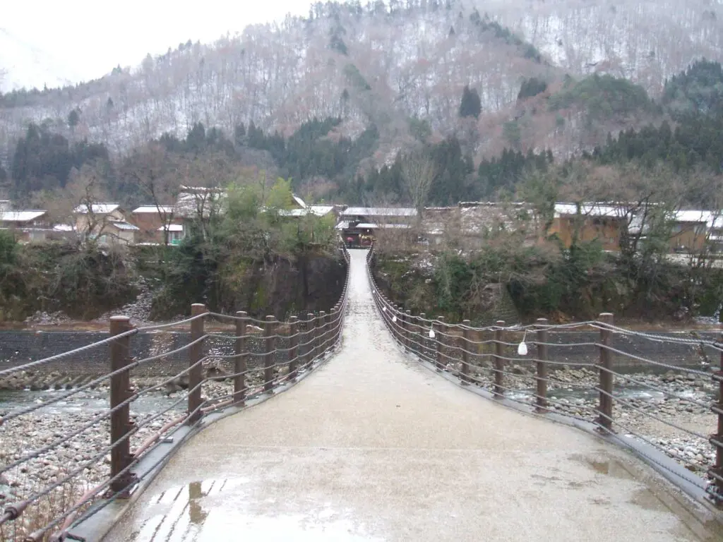 ところが、集落へ向かう長い橋を渡り始めた瞬間、雪がぴたりと止み、雲の切れ間からかすかに陽の光が差し込みました。