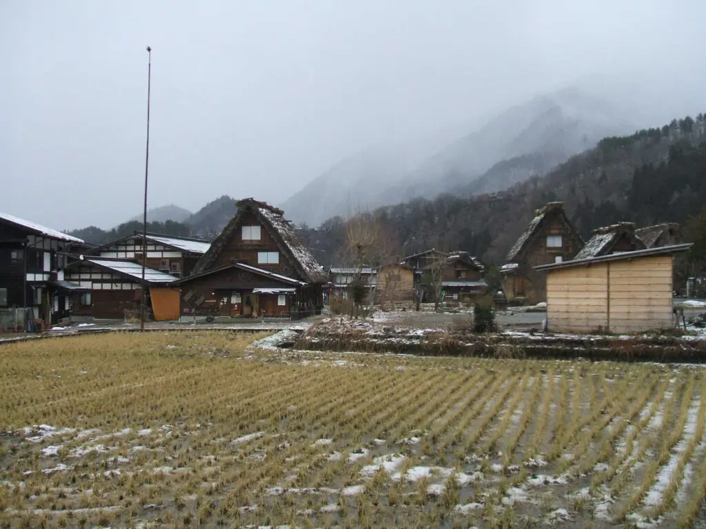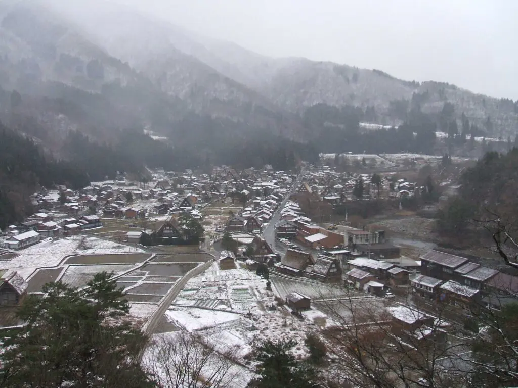 茅葺き屋根の家々が整然と並び、白い雪をまとった姿は絵本の世界そのものです。