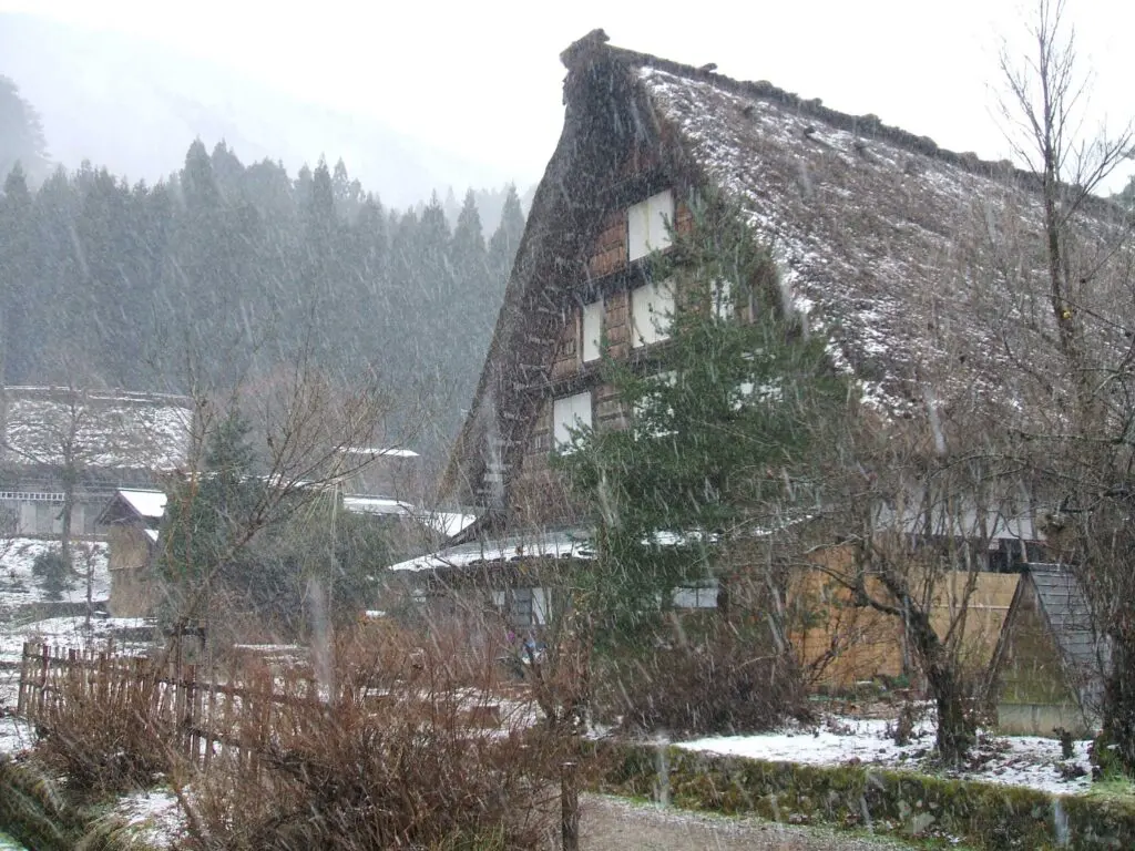白川郷に到着したときは、空は薄暗く雪がごうごうと降り続いていました。