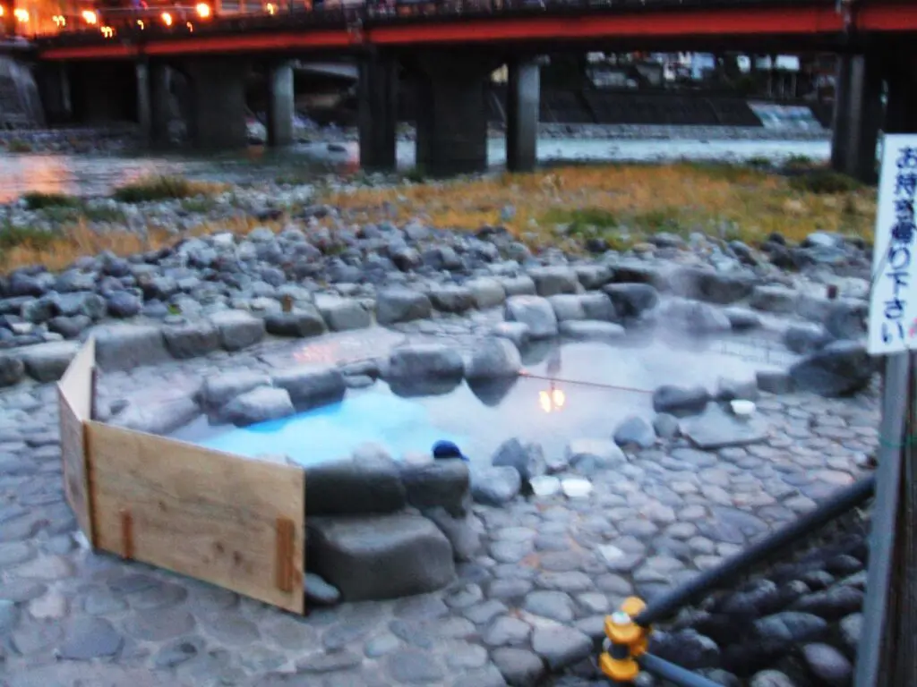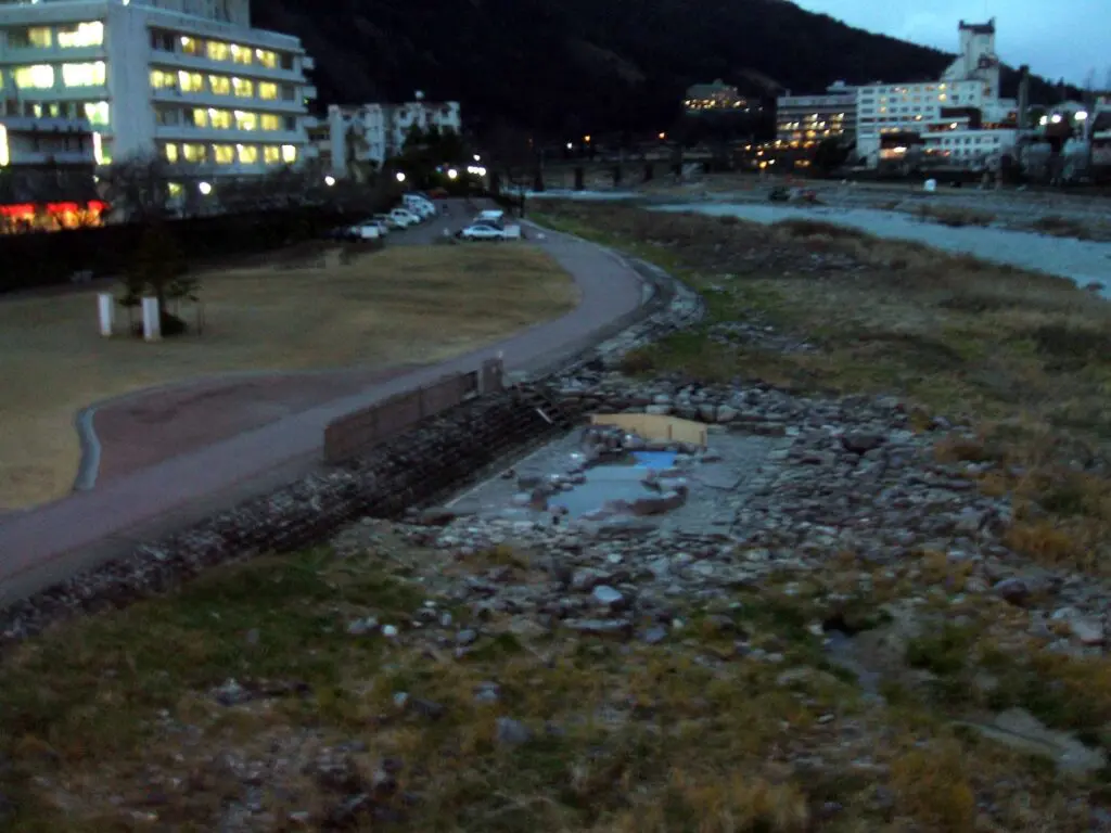 「どこから入ろうか」と地図を見ながら相談していると、ふと橋の下の河原に目をやると、なんと無料の露天風呂がありました。
