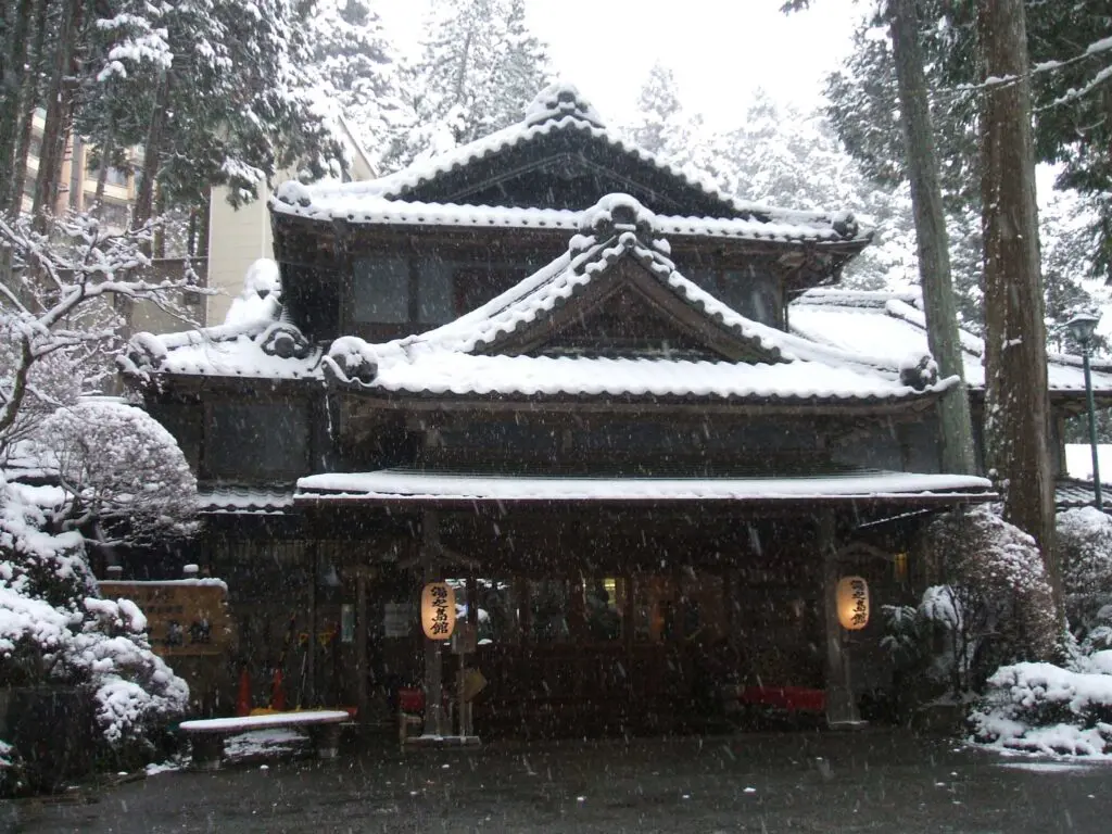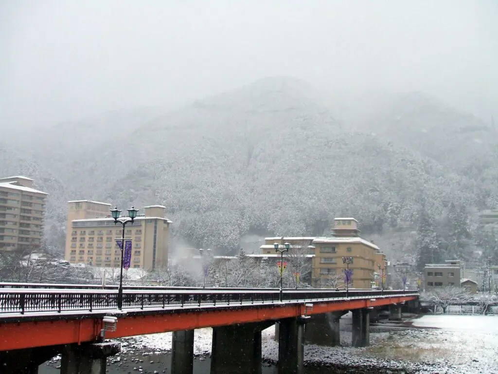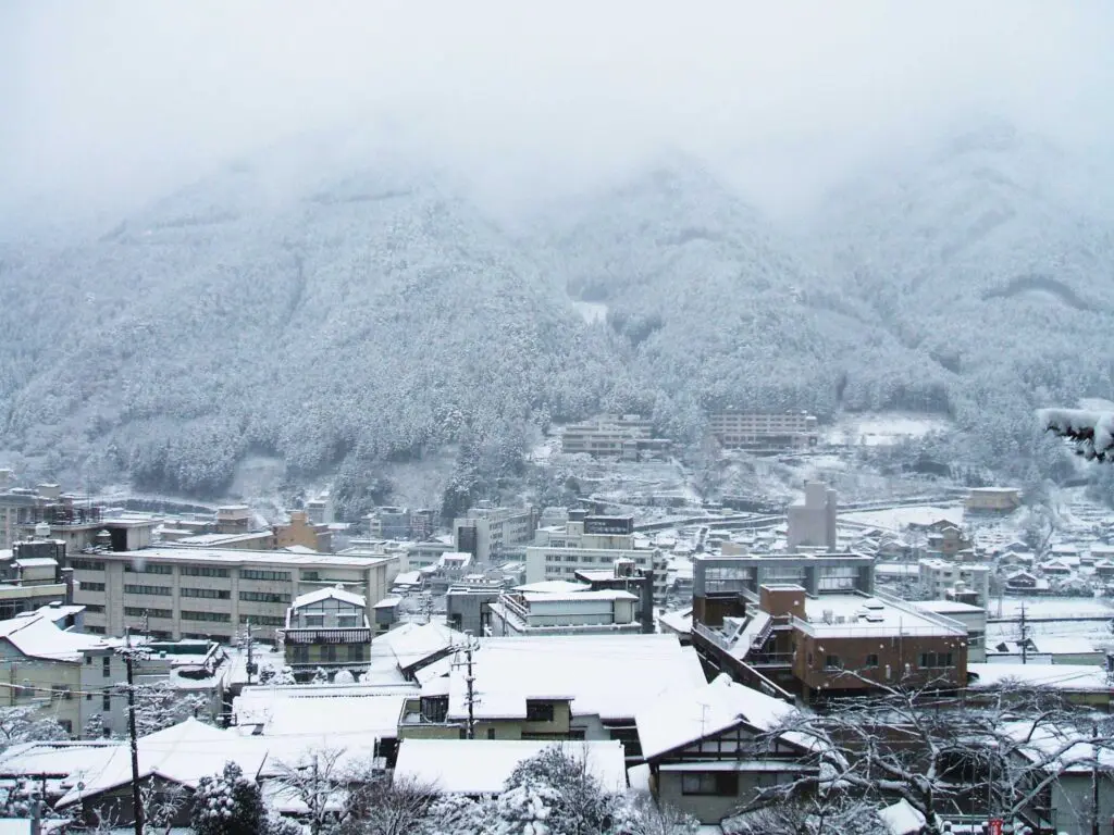 境内からは雪景色の下呂の街並みが一望でき、白い世界に包まれた温泉街はどこか神秘的で、しばらく見入ってしまいました。