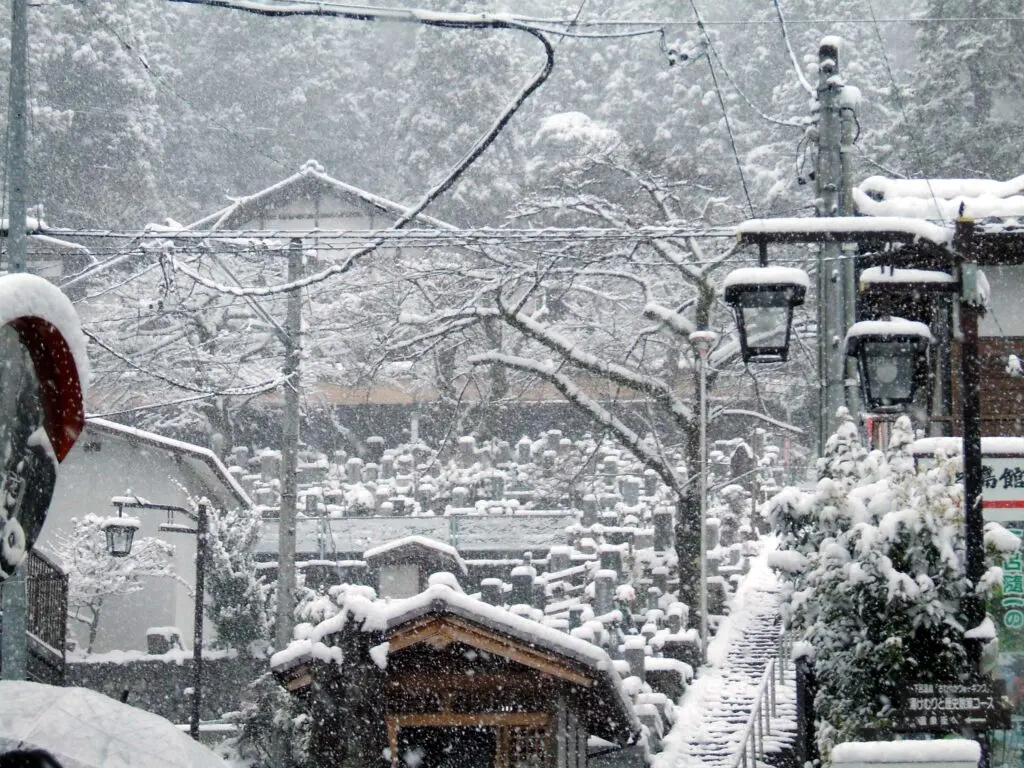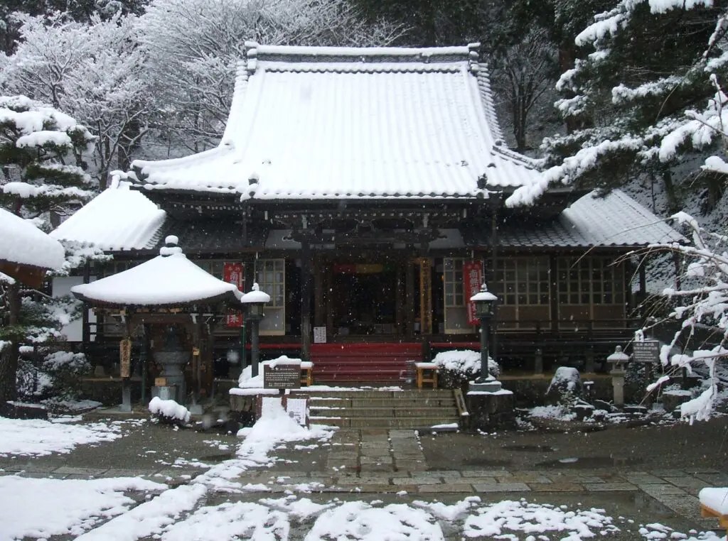 雪の降る中、急な階段を上っていくと、そこには静かなお寺がありました。