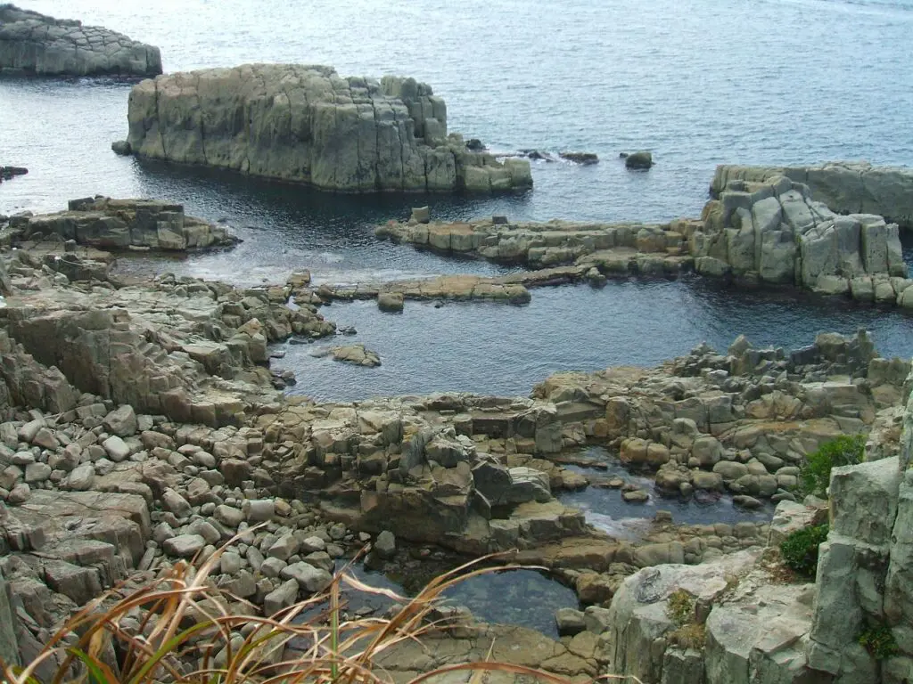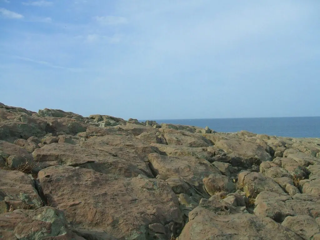 ごつごつとした柱状節理の岩場があちこちに点在しており、まるで大地がそのまま隆起したような迫力があります。規則的なようでいて不揃いな岩の形が、自然の力の大きさと時間の積み重ねを静かに物語っているように感じられます。