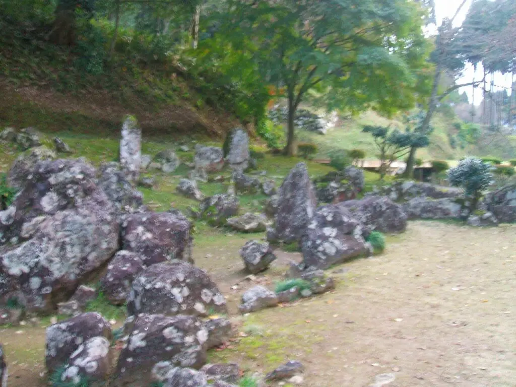 この庭園の特徴は、何といっても「立石」と呼ばれる、すっと屹立する石を多用した独特の造りにあります。 一般的な枯山水とは少し異なり、石そのものが強い存在感を放ち、静かな山あいの中で不思議な緊張感を生み出しています。 その独創性は現代の芸術家にも響いたようで、岡本太郎もこの庭園を訪れ、強い感銘を受けたと伝えられています。