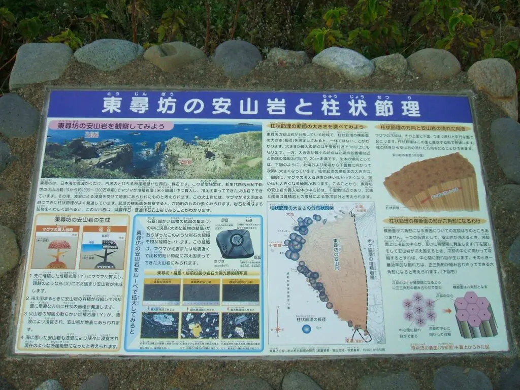 東尋坊は、約1200〜1300万年前の火山活動によって生じたマグマが冷えて固まる際に形成された、安山岩の五〜六角形の柱状の割れ目(柱状節理)が、日本海の荒波による浸食で姿を現した断崖です。