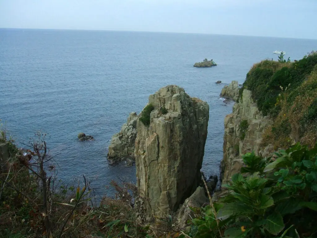一本だけ海に向かって突き出した、ひときわ目を引く岩が「蝋燭岩」です。細長い形がろうそくの炎のように見えることから、この名が付けられています。もうひとつ「ライオン岩」と呼ばれる岩もあるのですが、岸から眺めた限りでは、その姿をはっきりと見分けることはできませんでした。