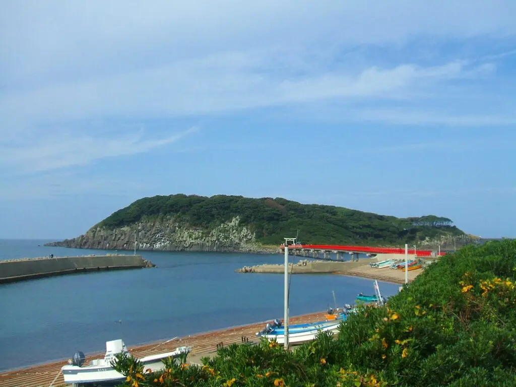 しばらく歩いていると、海にかかった赤い橋が見えてきました。橋の先にあるのは「雄島(おしま)」という島で、別名「日本海の江の島」とも呼ばれているそうです。