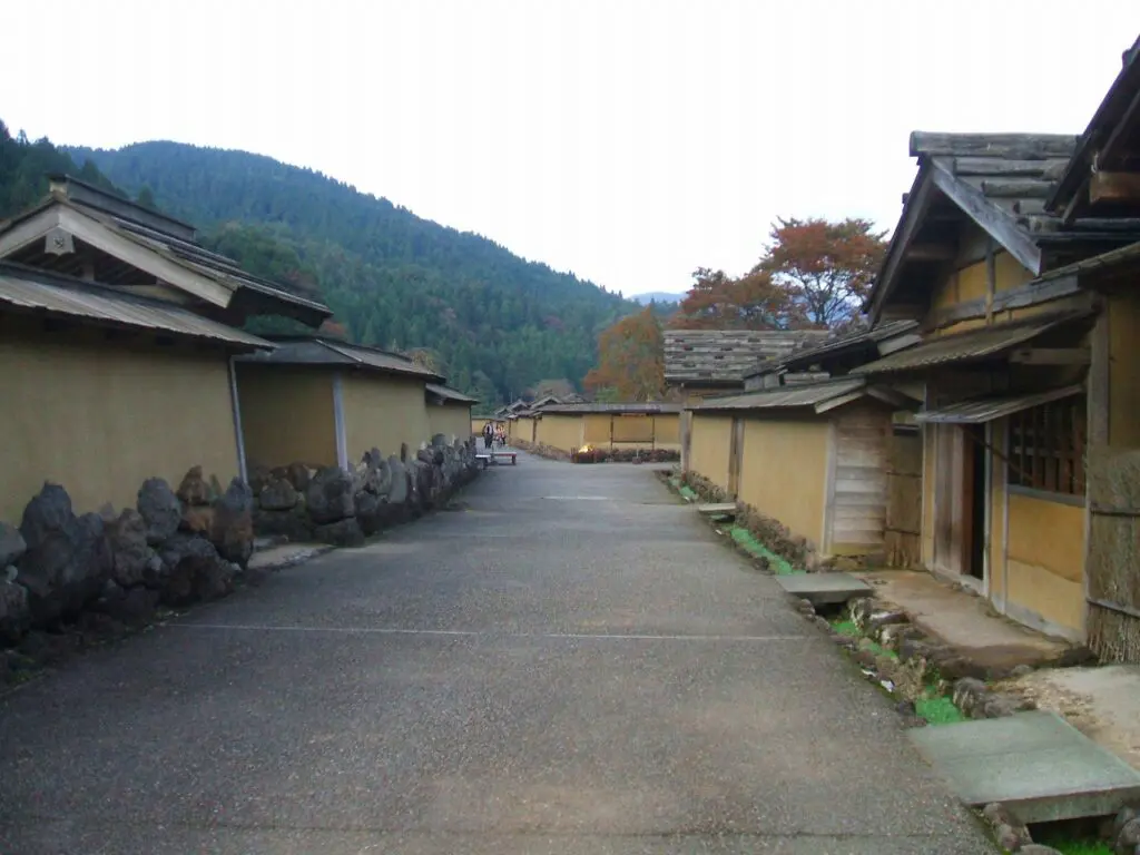 もっとのんびりと歩きたかったのですが、気がつくと谷間には夕暮れの影が深く落ち、あたりはとっぷりと日が暮れかかっていました。 復元町並みの土塀や家並みも、夕日の残光を受けて少しずつ色を失い、戦国の面影だけが静かに浮かび上がってくるようでした。