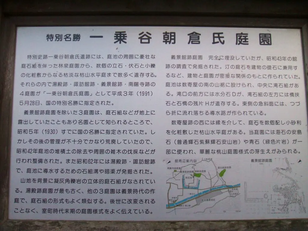 館の内部には、会所、主殿、小座敷、台所などの建物が整然と配置されていたとされ、戦国大名の暮らしぶりを今に伝える貴重な遺構となっています。 さらに敷地内には、日本最古といわれる花壇も含まれており、当時の朝倉氏が文化や美意識を大切にしていたことが感じられます。