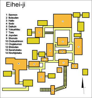 境内配置図 1.山門、2.仏殿、3.法堂、4.僧堂、5.大庫院、6.浴室、7.東司、8.承陽殿、9.鐘楼堂、10.勅使門、11.祠堂殿、12.中雀門、13.傘松閣、14.吉祥閣(参考:ウィキより)