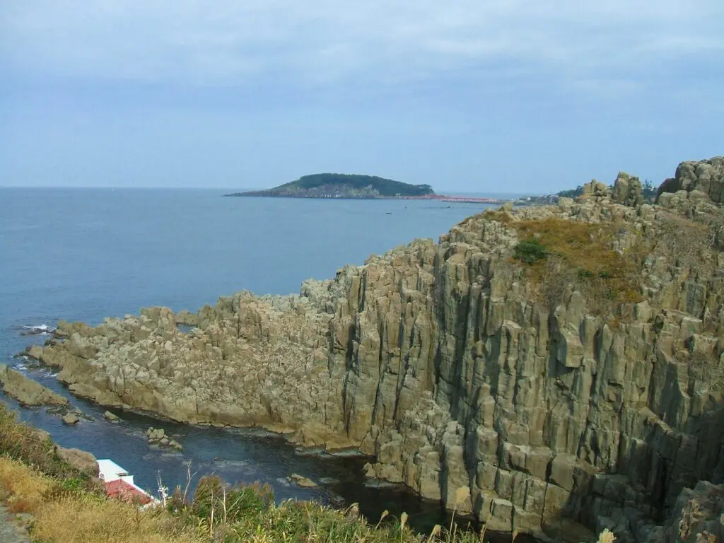 柱状節理に囲まれた小さな入江があり、その下へは降りられるようになっていて、遊覧船の乗り場が設けられています。断崖の上から見下ろすと、規則正しい岩の壁が湾を囲むように立ち並び、まるで天然の劇場のような独特の景観をつくり出しています。