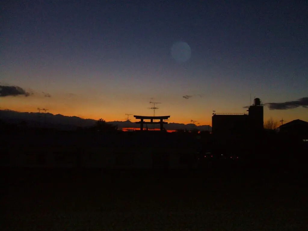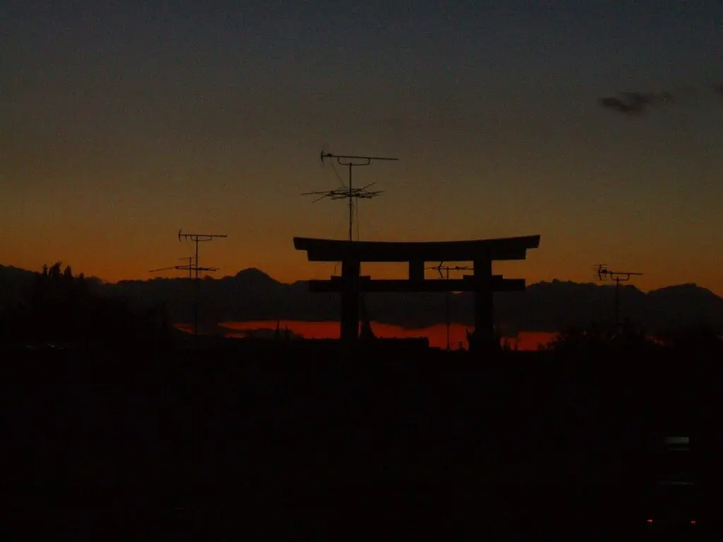 夕暮れ時の大神神社の大鳥居に着くと、空はすでに群青色へと移り変わり、鳥居の輪郭だけがほのかに浮かび上がっていました。以前訪れたときもそうでしたが、なぜかここで写真を撮ると、オーブがよく映ります。