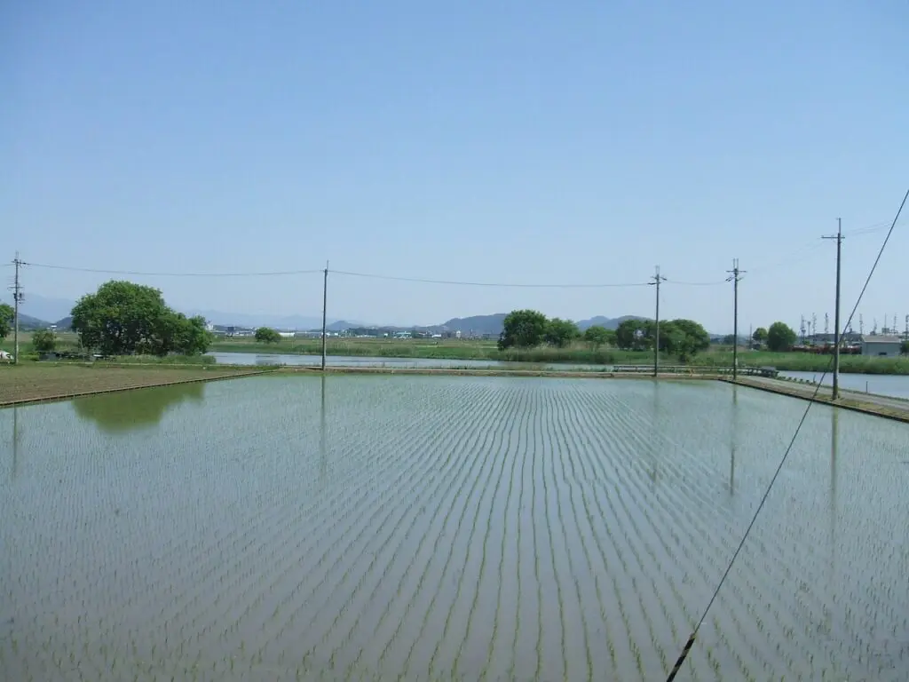 遠くに見える山の稜線はやわらかく、空は広く、雲の影がゆっくりと田んぼの上を流れていきます。