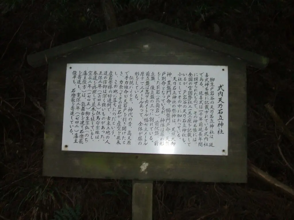 駐車場からおよそ一キロほど歩くと、ようやく天石立(あまのいわたて)神社の鳥居にたどり着きました。 人の気配がほとんどない山奥に、ぽつんと立つ鳥居はどこか不気味で、しかし同時に胸が高鳴るような不思議な魅力があります。