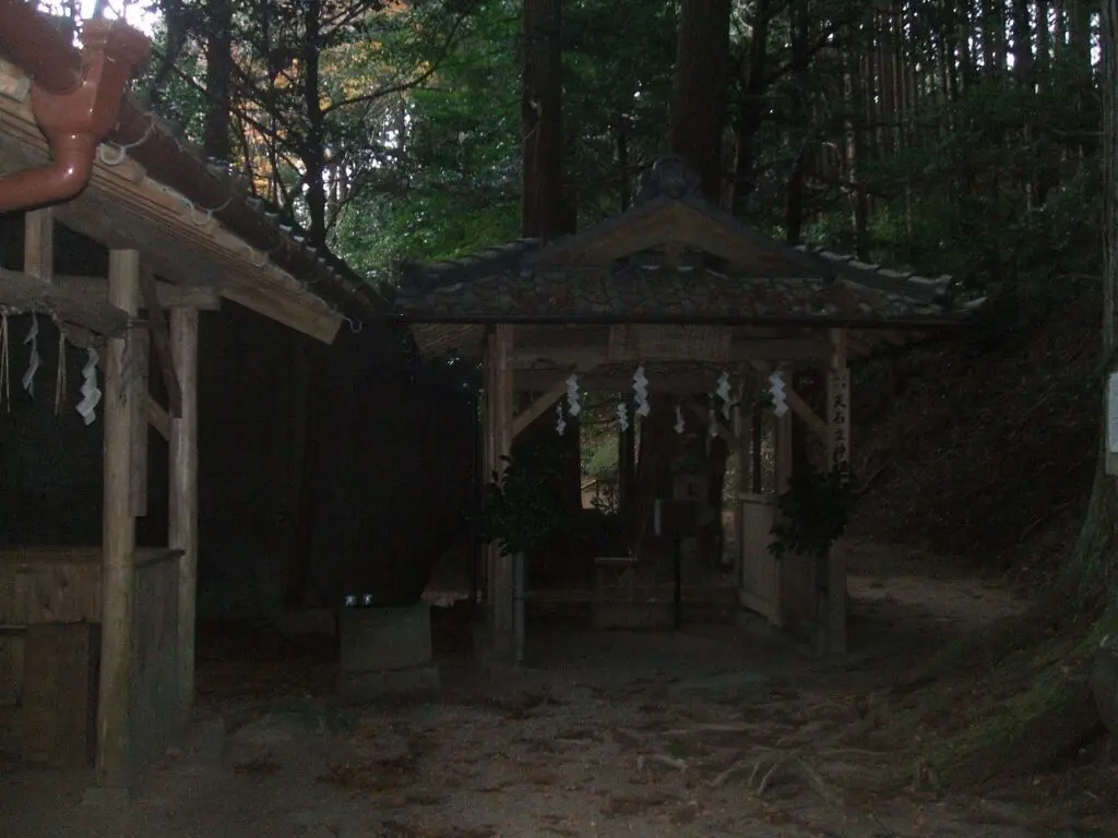 鳥居をくぐってさらに奥へ進むと、杉並木の影の中に小さな祠がぽつんと現れました。 苔むした石段の先にひっそりと佇むその祠は、どこかおどろおどろしい雰囲気をまとっていて、思わず足が止まります。