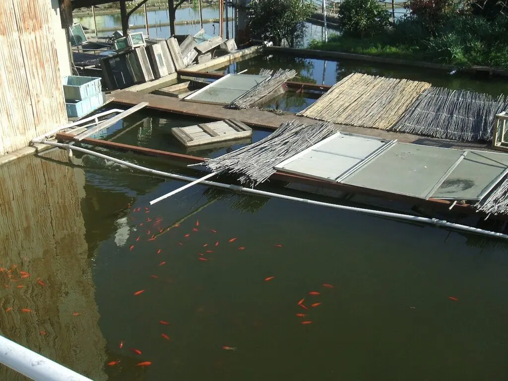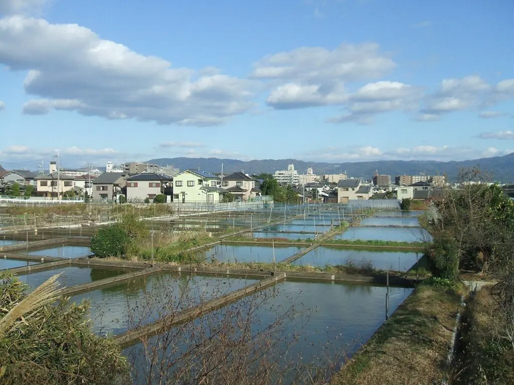 そのまま街の南へ向かい、金魚の養殖地を目指しました。道中は住宅街の静けさが続き、遠くから水の流れる音が聞こえ、やがて、ため池が広がるのどかな風景が現れます。水面には金魚がゆったりと泳ぎ、赤や白の色が陽光に照らされて揺らめいています。
