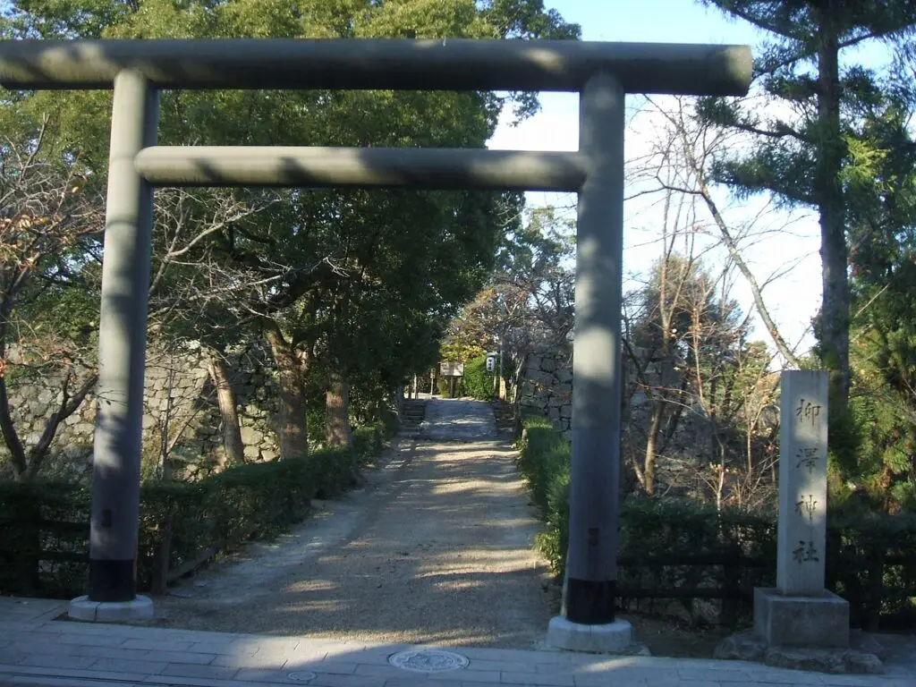 柳沢氏は、河内源氏から甲斐武田氏へと続く名門の流れをくむ一族とされ、その血筋の重みが郡山藩の格式にも反映されています。そのため、神社の入口に立つ社号標には「旧川越甲府城主 柳澤美濃守吉保公」と刻まれており、吉保がかつて川越藩主・甲府藩主を歴任した名将であることを静かに伝えています。