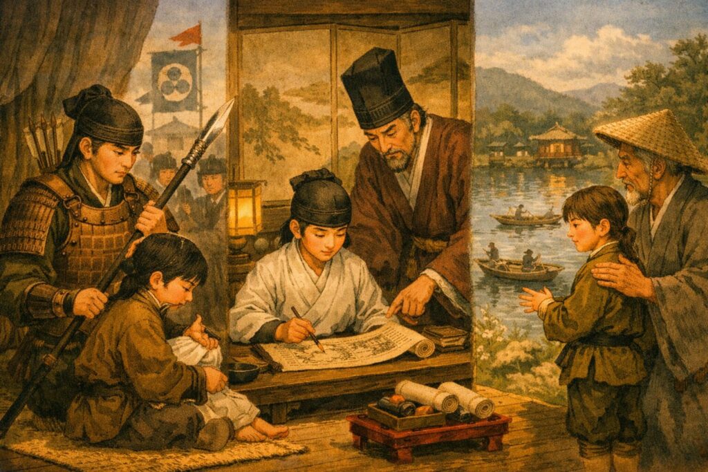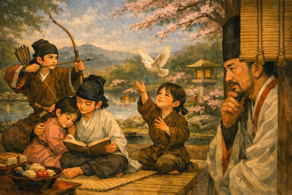 ある朝、学問所では額田大中日子命が古い巻物を広げていました。
