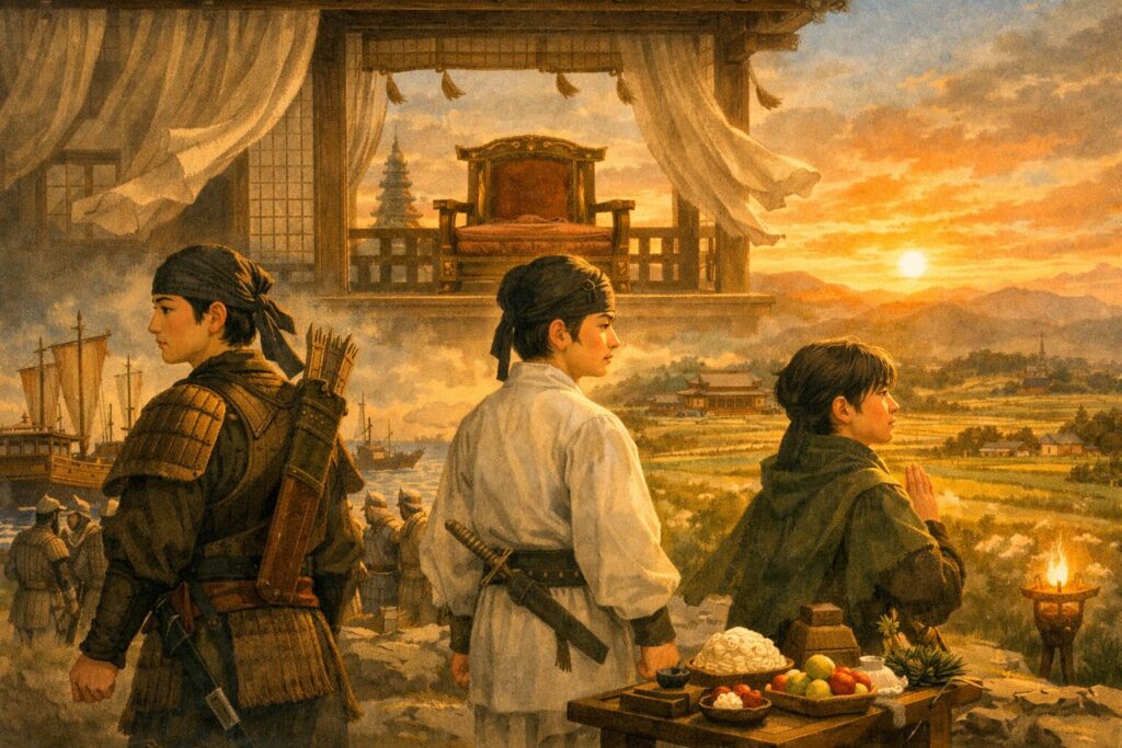その静けさの中、品陀和気命(ほむだわけのみこと/応神天皇)はひとり庭に立ち、湖の向こうに連なる山々を見つめていました。