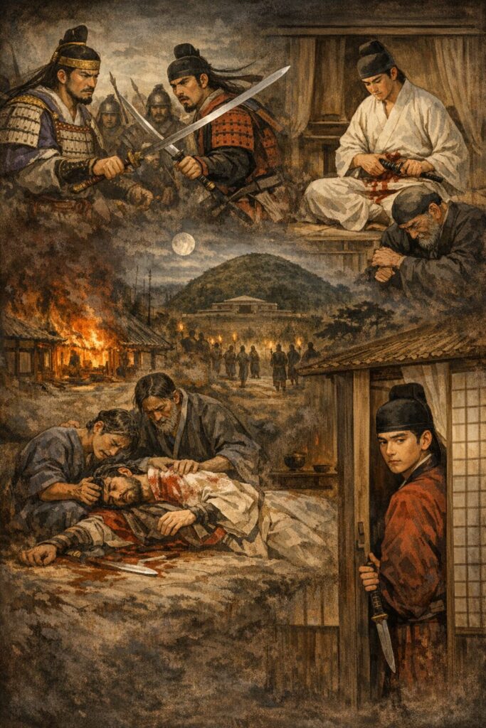 難波宮は酒宴の熱気に包まれ、灯火が揺れ、楽人の琴の音が夜空に溶けていました。