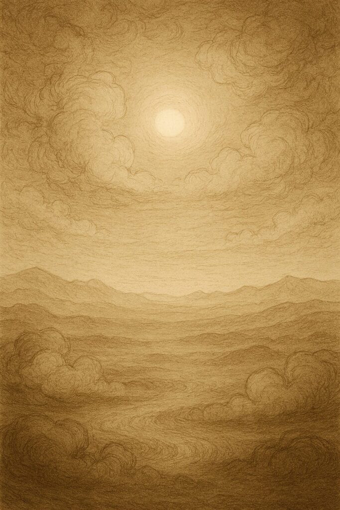 その気配は大地と天のあいだをゆっくりと満たし、やがて淡い雲のような光を帯び始めます。