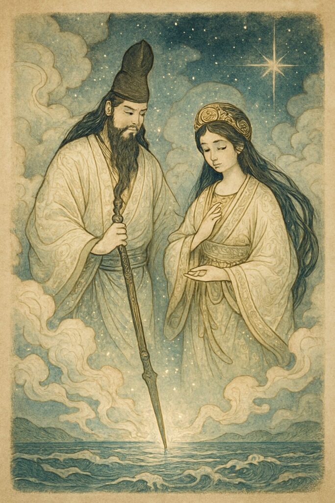 島が生まれた瞬間、天の浮橋の周囲には柔らかな風が吹き、世界が初めて“形”を持ったことを祝福するかのように、光が揺らめきました。