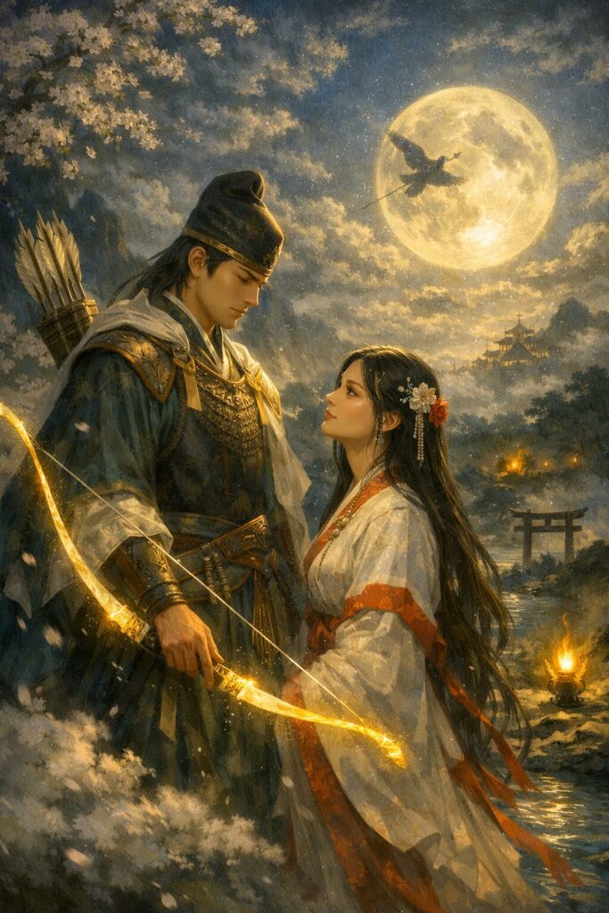 そこで高皇産霊尊(たかみむすひのみこと)は、天稚彦(あめわかひこ)に天鹿児弓(あまのかごゆみ)と天羽羽矢(あまのははや)を授けて遣わしました。