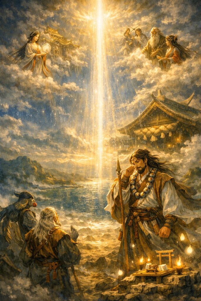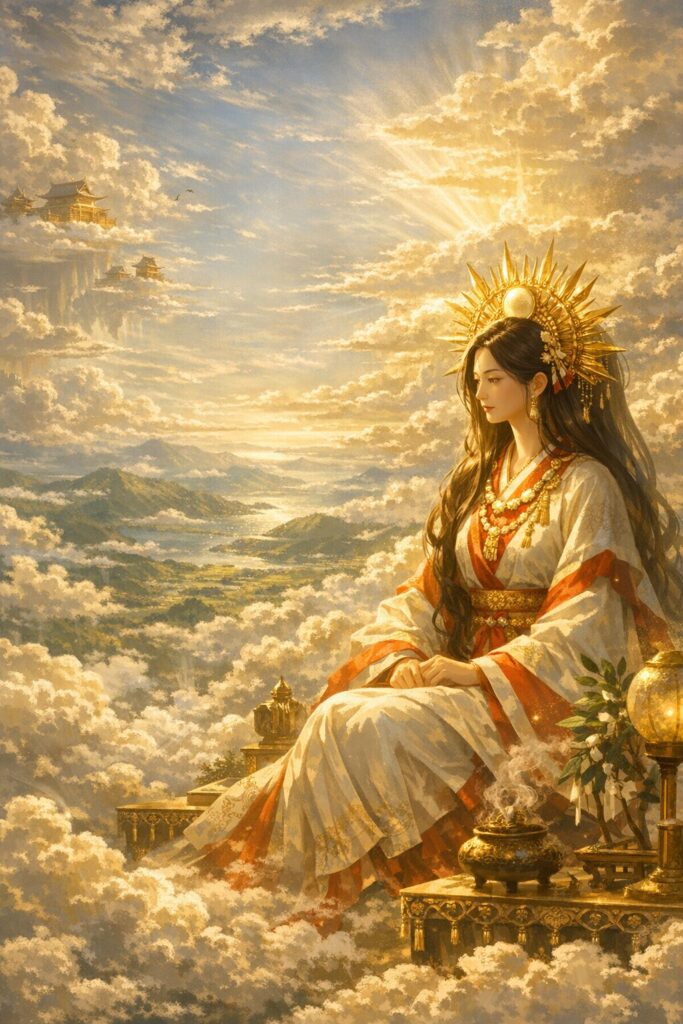 その中心に座す 天照大御神(あまてらすおおみかみ) は、静かに下界を見つめていました。