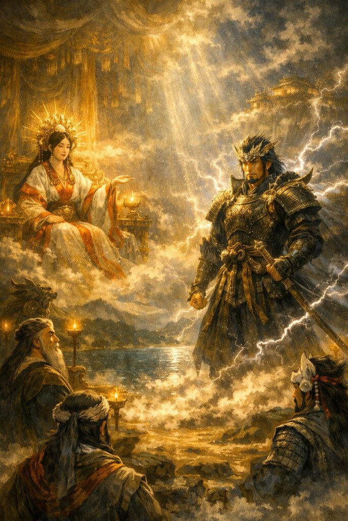 天照大御神は静かに立ち上がり、神々に向けて言葉を放ちます。