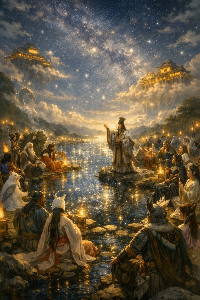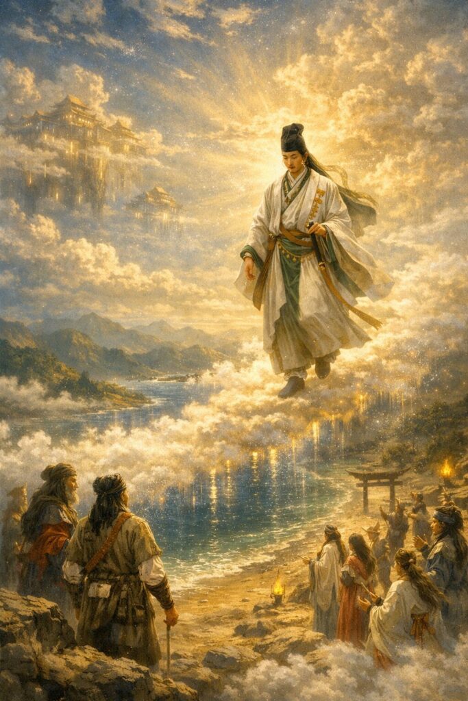 白金色の雲がゆるやかに流れ、風は澄んだ音を立てて神々の間を渡っていきます。