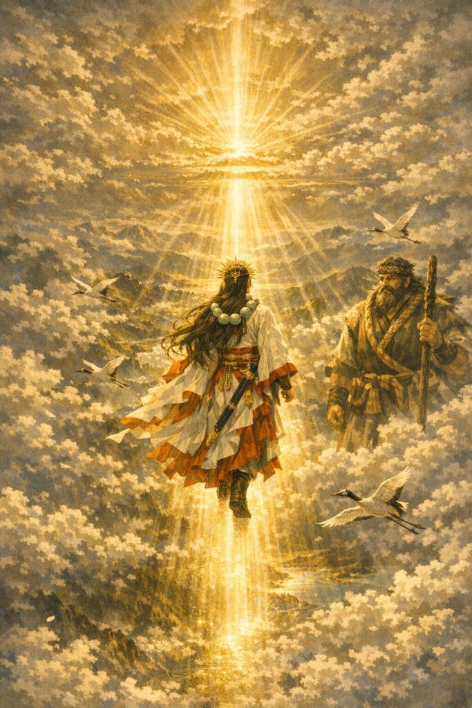 やがて、雲の切れ間から葦原中国の大地が姿を現します。