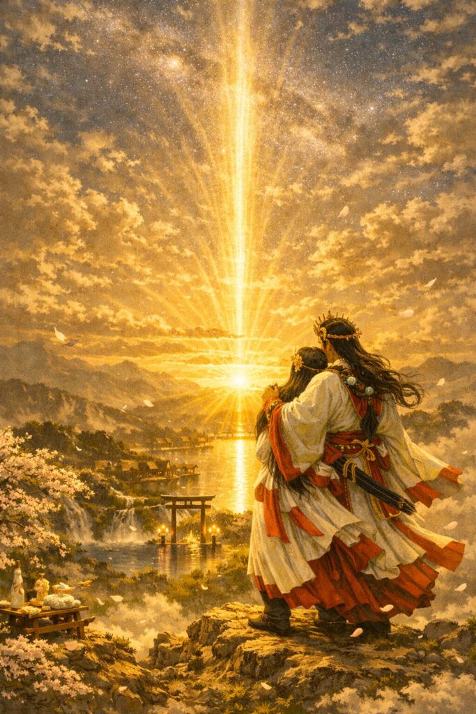 その後、高皇産霊尊(たかみむすひのみこと)は真床覆衾(まどこおうふすま)をもって皇孫・天津彦根火瓊瓊杵根尊(あまつひこねほのににぎねのみこと)に着せ、天八重雲(あまのやえくも)を押し分けて降らせました。