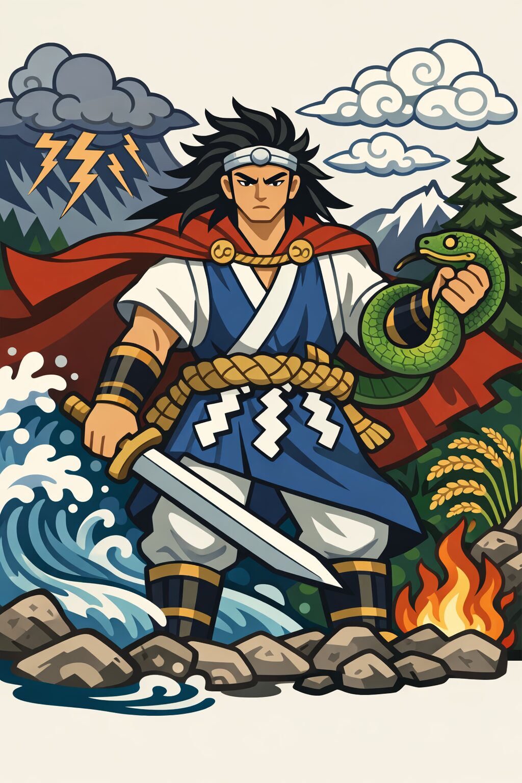 須佐之男命(すさのおのみこと)は、イザナギの禊から生まれた三貴子の一柱として、海原・暴風・洪水といった荒々しい自然の力を体現する神です。その本質には常に「水の霊力」があり、荒れ狂う川のうねり、氾濫する水の暴威、暴風雨の激しさといった自然現象が神格として結晶した姿だといえます。高天原では荒ぶる性質が前面に出て天照大神との対立を生みますが、地上に降り立つと八岐大蛇を退治する英雄としての側面が現れ、さらに根の国では大国主に試練を与える老王のような威厳を帯びた姿へと変化します。このように、須佐之男命は「荒ぶる水霊」から「秩序をもたらす守護神」へと段階的に姿を変える、多層的で動的な神格を持つ存在です。荒魂と和魂が交錯するその変容こそが、古代の人々が水の恐怖と恵みの両面をどのように理解し、祈り、物語化したかを象徴しています。