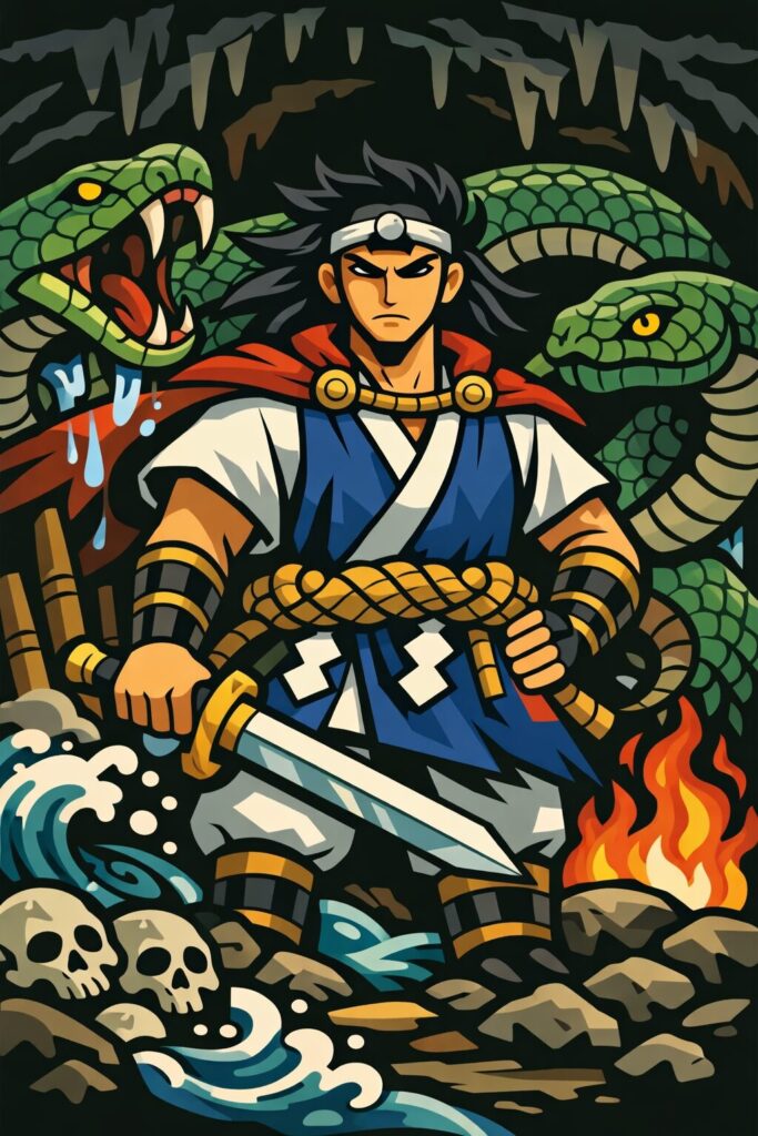 さらに、根の国で大国主に課す試練の場面では、蛇がうごめく室、火の室、血の池といった象徴が連続し、そこはまさに地中の霊力が凝縮した「地霊の宮」として描かれます。スサノオはその中心に座し、蛇霊を従える王のような姿を見せます。これは、彼自身が水と大地の境界に立つ存在であり、荒ぶる蛇霊を支配し、時にそれと同化する「蛇神の王」としての側面を持つことを示しています。水の暴威を鎮める力と、地の奥深くに潜む霊力を統べる力。その両方を兼ね備えた神として、スサノオは古代の自然観の中心に位置づけられていたのです。