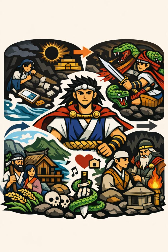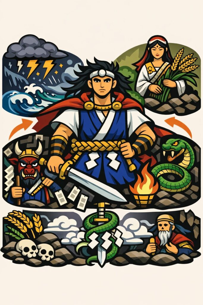 この一連の流れは、スサノオが「破壊の神」から「秩序をもたらす守護神」へと変容していく過程そのものであり、古代の人々が自然の猛威と恵みをどのように理解し、物語化したかを鮮やかに示しています。