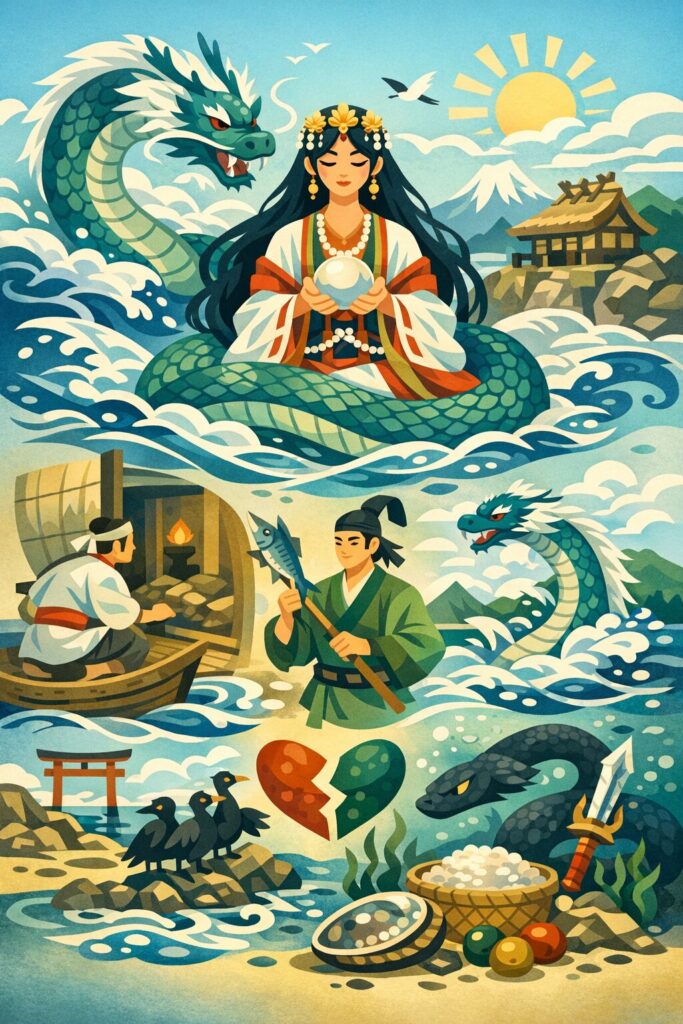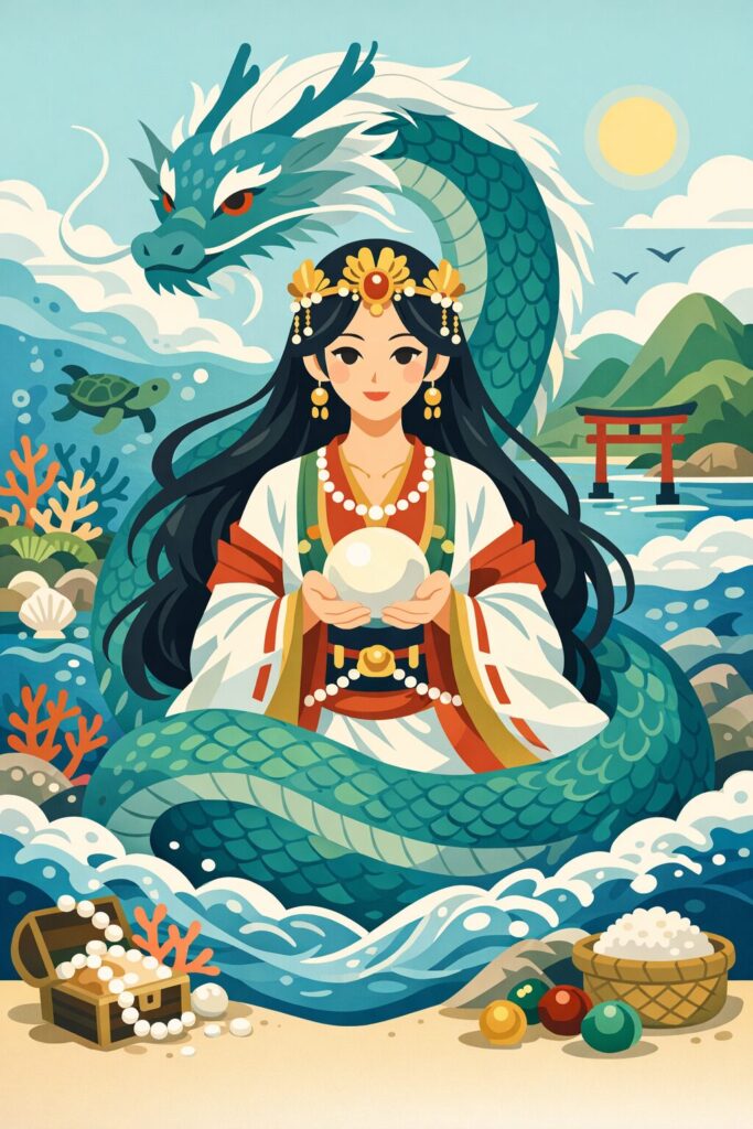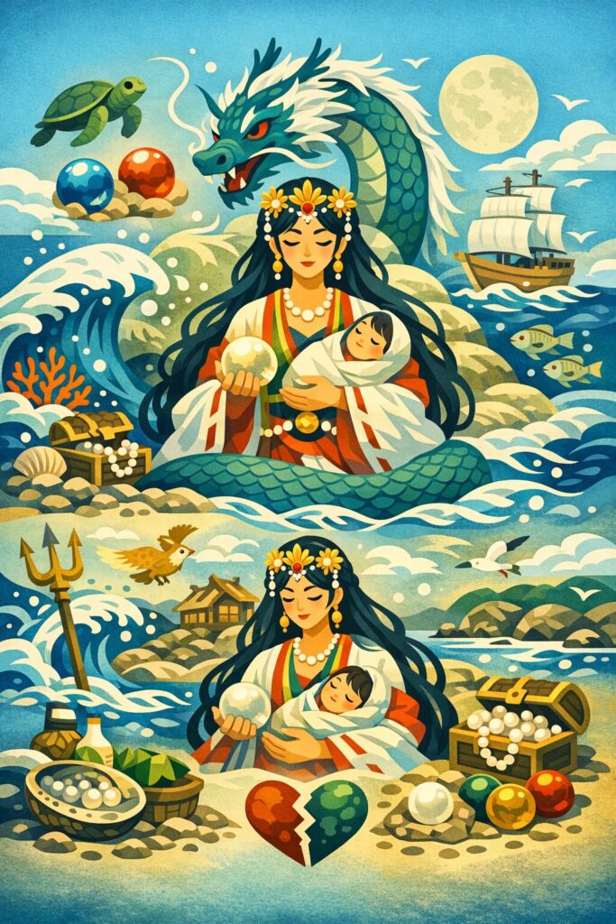豊玉姫は、父・綿津見神と山幸彦の和解を取り持ち、 潮満珠(しおみつたま)・潮干珠(しおひるたま)という海神の霊力の象徴を授ける中心人物です。 この二つの珠は、