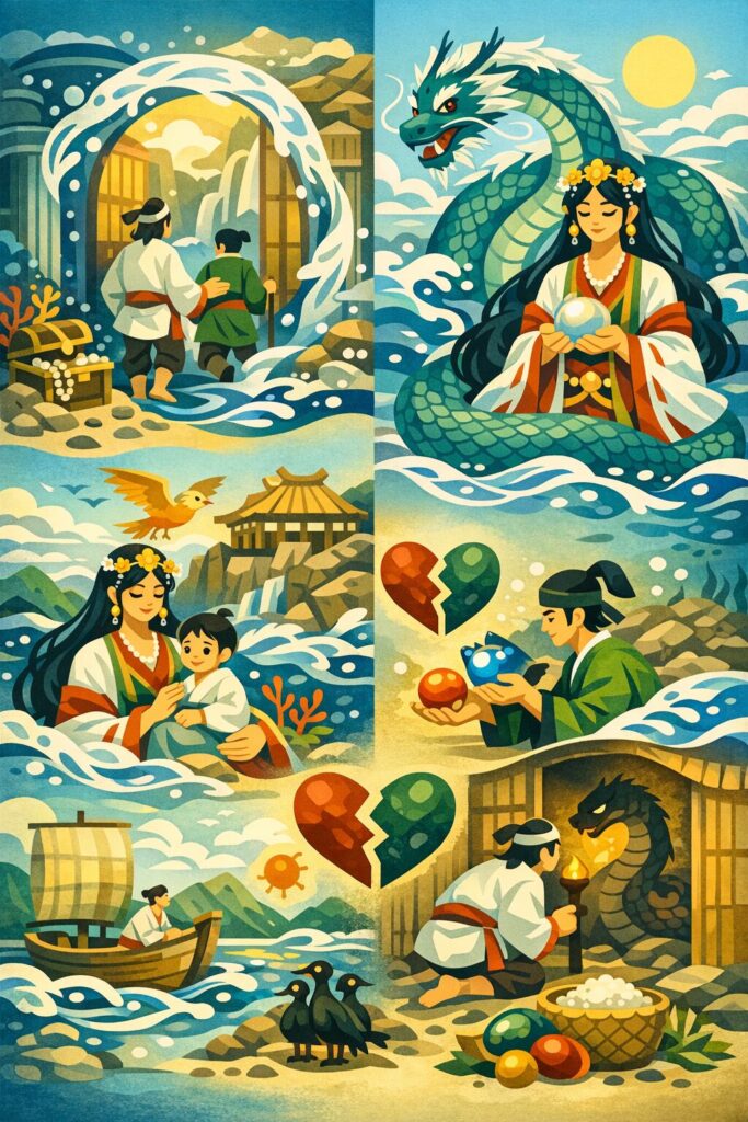 ・潮を引かせ敵を救う という自然の力を自在に操る王権の象徴であり、のちの天孫系統の権威の根拠となります。 豊玉姫はこの授与の場に立ち会い、異界の力を人間世界へ移す媒介者=王権の母体として機能します。